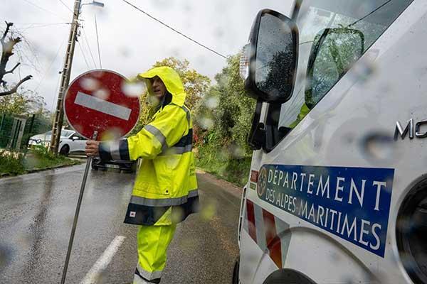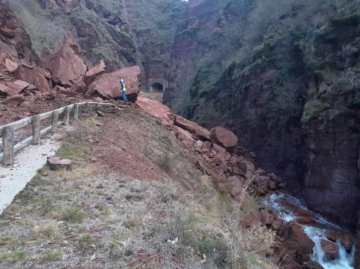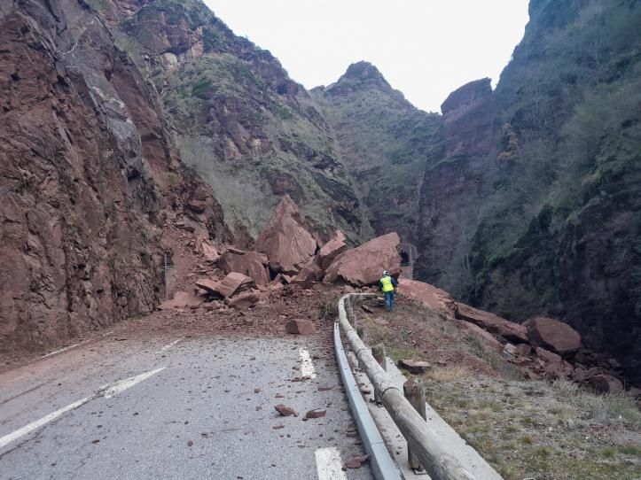 Un amas rocheux en cours d’inspection par un géologue et le service des routes du Département obstrue actuellement la chaussée et une partie du lit du Cians.